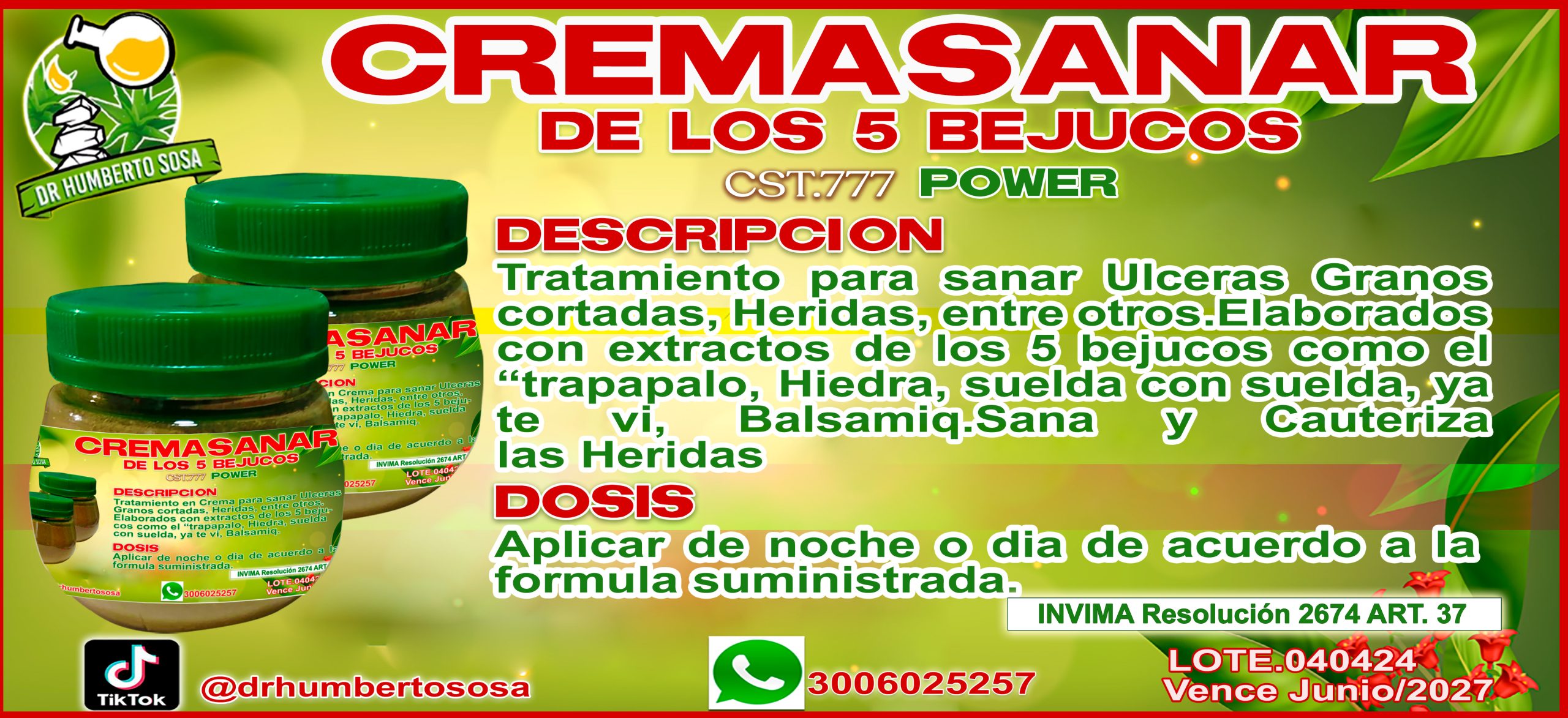 Tratamiento para sanar úlceras, granos cortados, heridas, entre otros.Elaborados con extractos de los 5 bejucos como el “trapapalo», Hiedra, suelda con suelda, ya te vi, Balsamiq. Sana y Cauteriza las Heridas