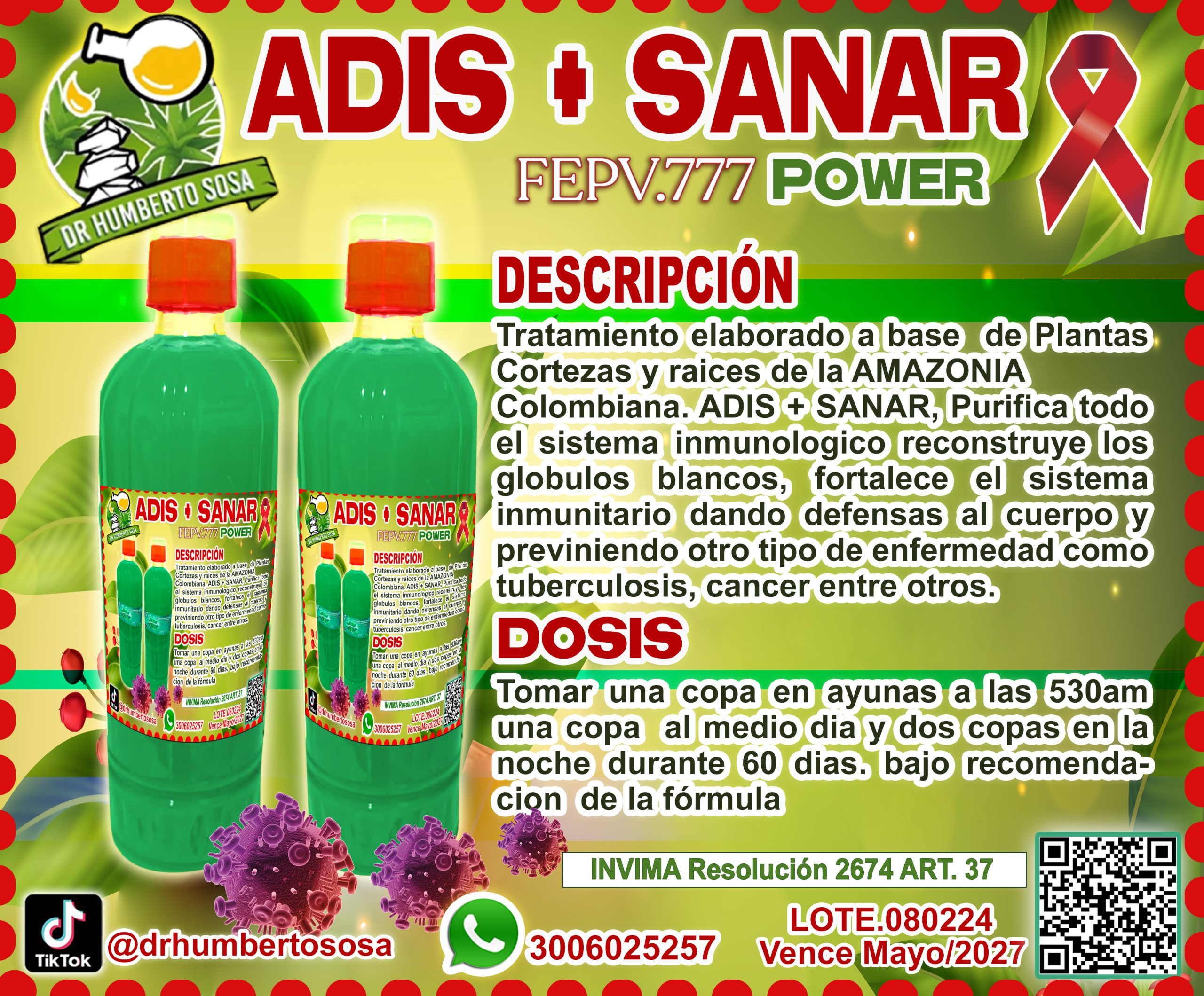 Tratamiento elaborado a base de plantas cortezas y raíces de la AMAZONIA colombiana. VIHSANAR, purifica todo el sistema inmunológico, reconstruye los glóbulos blancos, fortalece el sistema inmunitario dando defensas al cuerpo y previniendo otro tipo de enfermedad como tuberculosis, cáncer, entre otros.